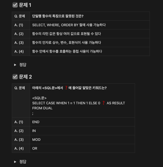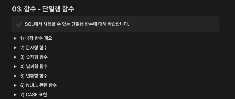 다행이도 강의노트에 함수 종류별로 설명과 실행되는 쿼리 예제들이 있어 전체적으로 어떤게 있고 어떻게 사용되는지 쉽게 이해할 수 있었습니다. 전공했더라도 과거 배웠던 내용들을 되세기면서 강의를 들으면 큰 어려움 없이 자격증을 합격할 수 있을거에요.